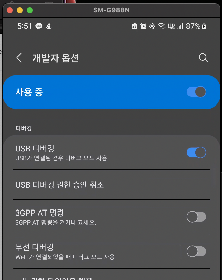 설치가 끝났으면 우선 연결하고자 하는 기기의 개발자 옵션을 키고, usb 디버깅을 활성화 시킨다.