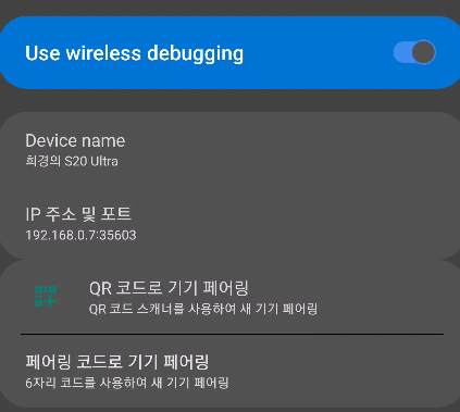 여기서 입력하는 주소와 포트번호는 위에서 사용한 페어링을 위한 주소가 아닌, 그 위에 있는 사진에서 볼 수 있는 무선 디버깅 탭에서 볼 수 있는 IP 주소와 포트 번호를 입력해주면 된다.