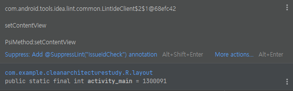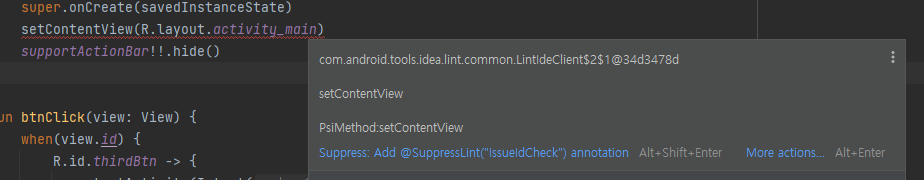 따라서 그냥 사용되는 setContentView를 사용하면 에러가 표시되도록 하고, Databinding을 사용하는 setContentView의 경우 에러가 뜨지 않도록 해둔 것이다.