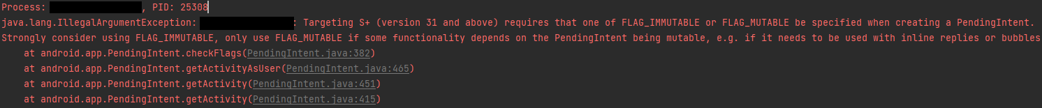 java.lang.IllegalArgumentException: *.*.*.*: Targeting S+ (version 31 and above) requires that one of FLAG_IMMUTABLE or FLAG_MUTABLE be specified when creating a PendingIntent. Strongly consider using FLAG_IMMUTABLE, only use FLAG_MUTABLE if some functionality depends on the PendingIntent being mutable, e.g. if it needs to be used with inline replies or bubbles.