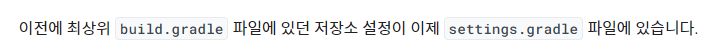 이처럼 저장소 설정 부분은 settings.gradle로 이동 되었다.