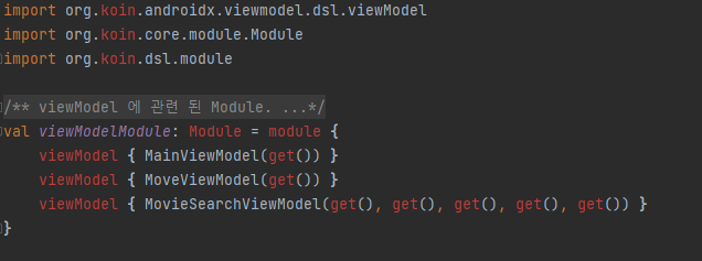 세 번째 VM인 MovieSearchViewModel 같은 경우 5개의 파라미터를 사용하는데, 이것들을 생략하고 그냥 클래스 이름만으로 선언해보니 상당히 편하다는 것을 느낄 수 있었다.