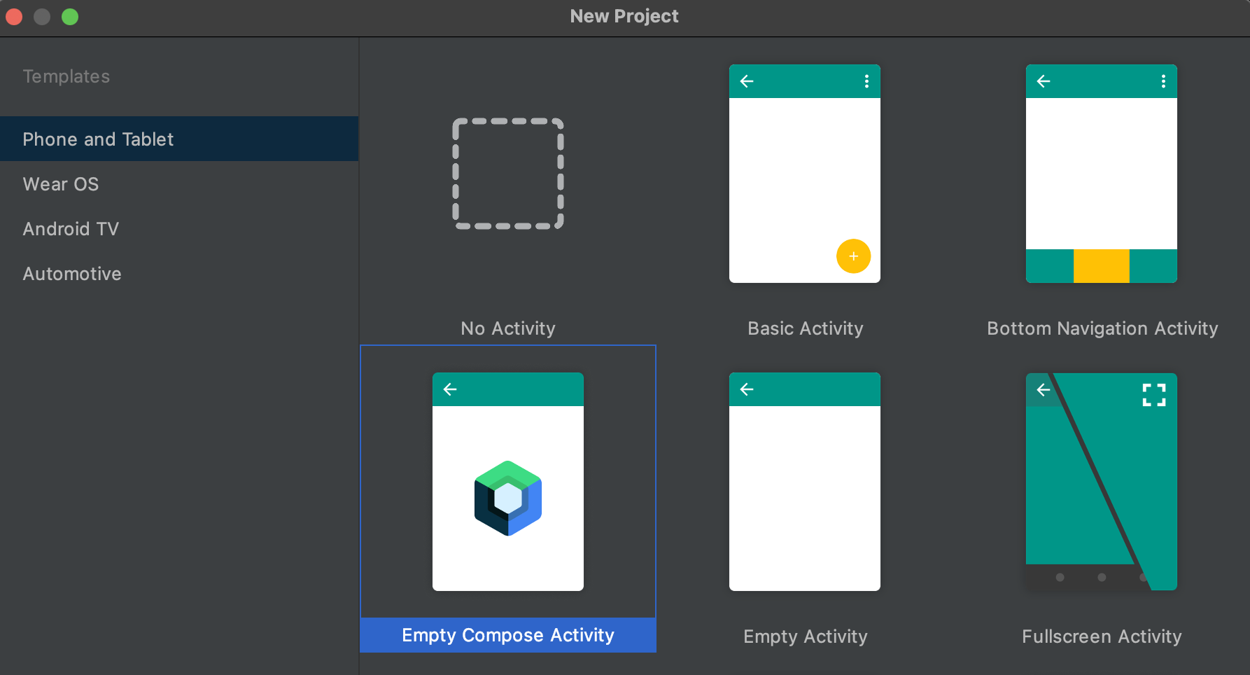 아직 제대로 된 사용법을 모르기 때문에 기존의 XML을 사용한 프로젝트를 변경하는 것이 아닌, 새로운 프로젝트를 만들어서 Compose를 사용해보도록 하자.