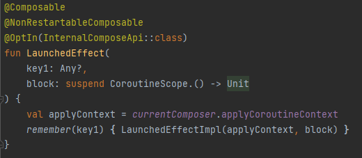 간단하게 말하면 Composable에서 비동기 관련된 처리할 때 사용할 수 있는 Effect API 중 하나로, 다음과 같이 구현되어 있다.
