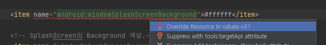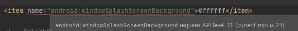 필자가 선언한대로 31 버전에 따른 Theme를 override 해서 사용하는 경우, 그 외의 버전에 대해서는 Splash Screen에 대한 한 속성 값이 존재하지 않는다.