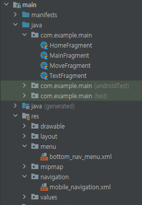Main 모듈에서는 모듈간 Fragment이동에 사용하는 ParentFragment로 MainFragment를 사용하고, 그 안에 ChildFragment로 Home, Move, Text를 선언하여 사용하고 있다.