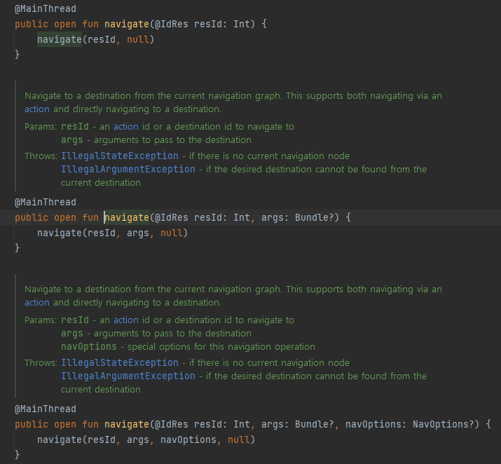 Navigation에서는 이처럼 navigate 함수가 오버로딩 되어있기 때문에 Bundle 타입의 변수를 쉽게 다른 Fragment에 전달할 수 있다.