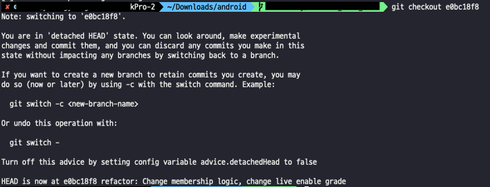 git checkout 'commit code' 를 사용하면 이처럼 메시지가 나오게 된다.