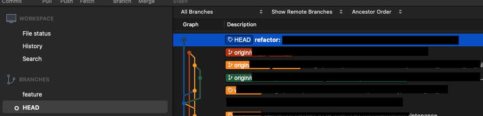 일단, 해당 커밋으로 체크아웃을 한 상태로 소스트리를 다시 확인해보면 다음과 같이 커밋이 돌아온 것을 확인할 수 있다.