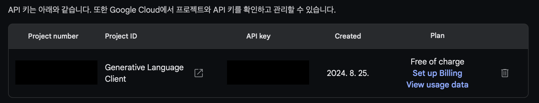 저것으로 프로젝트를 생성하려고 하면 API Key를 입력하라고 하는데, 위에서 확인했던 preview에서는 무료로 사용 가능하다는 말을 보고 공짜겠지 싶어서 키 생성을 들어가 보니,