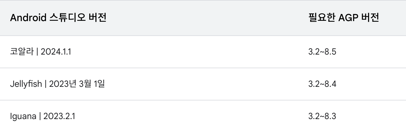kotlin 버전을 올리는 김에 프로젝트 환경을 전체적으로 업데이트시키자고 마음을 먹었고, 올해 초에 나와 많이 안정화된 android koala와 더불어 gradle을 올리고자 하였다.