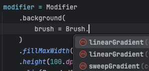 각 Component의 Modifier.background를 보면, color를 넣는 것뿐 아니라 brush를 통해 다양한 Paint 속성을 넣어줄 수 있다.