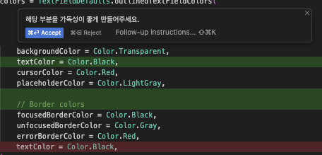 이 두개의 차이는, CHAT의 경우 결과 값을 직접 보고 Apply를 눌러야 코드에 적용되는 반면, Composer에서 수정되는 코드는 즉각 코드에 반영되며 필요에 따라 Accept, reject을 눌러 코드에 그대로 반영할 것인지 다시 되돌릴 것인지 선택하면 된다.