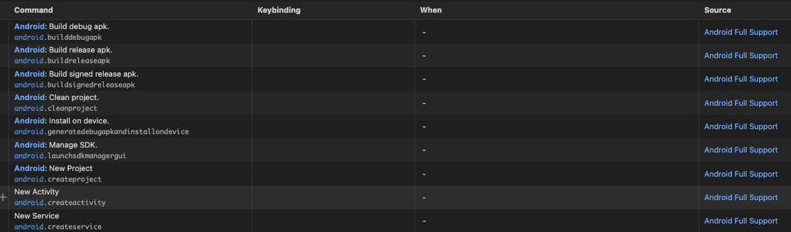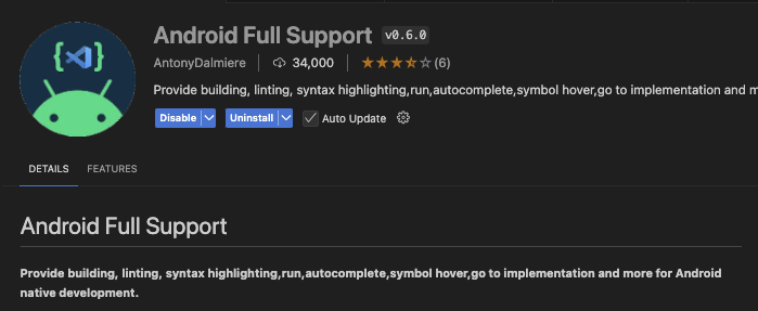 Android라는 extension에서는 제대로 된 도움을 받을 수 없었기 때문에 실질적으로 도움을 받을 수 있는 extension을 찾아보니 원하는 기능이 대부분 들어있는 Android Full Support라는 extension을 찾을 수 있었다.