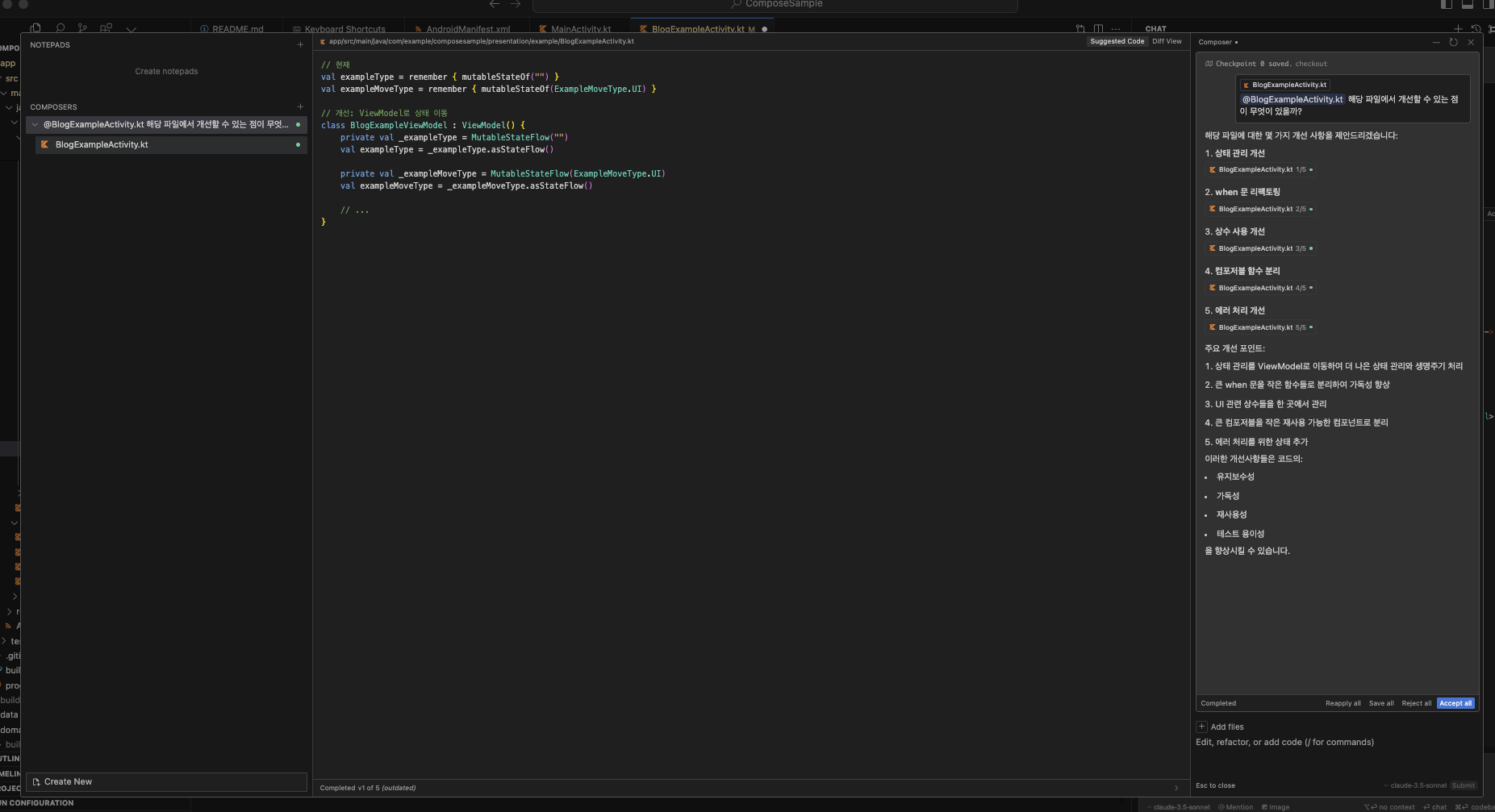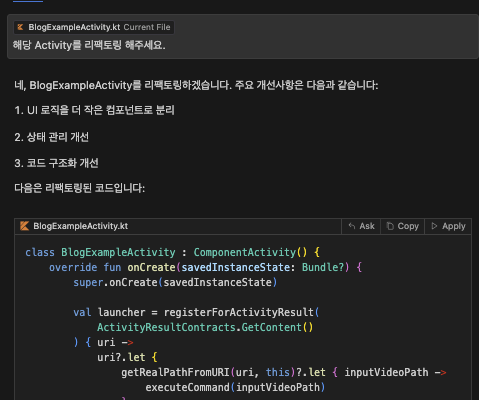 Android Studio에서는 Gemini를 제공해주고 있기 때문에 필자도 자주 사용하였고, 그것과 비슷한 느낌으로 사용하지 않을까 싶었는데, 의외로 더 깊게 사용이 가능할뿐더러 많은 부분을 커버할 수 있을 것이라고 생각이 들었다.