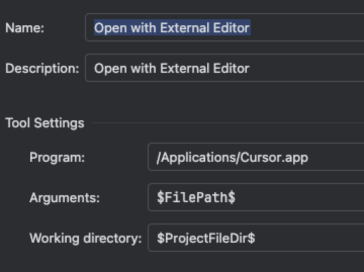 Program은 Cursor IDE를 열어줄 것이기 때문에 Cursor가 설치된 경로를 입력해주어야 하는데, 별다르게 위치를 변경하지 않았더라면 필자가 작성한 것처럼 Applications 아래에 위치하게 될 것이다.