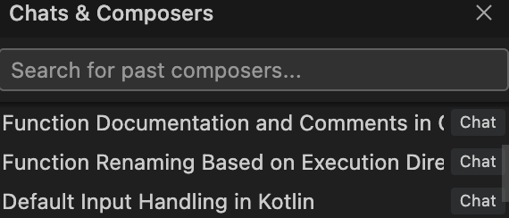 우측 상단에 있는 시계 아이콘을 토대로 History를 확인할 수 있으며, 이는 Chat, Composer를 모두 확인할 수 있습니다.