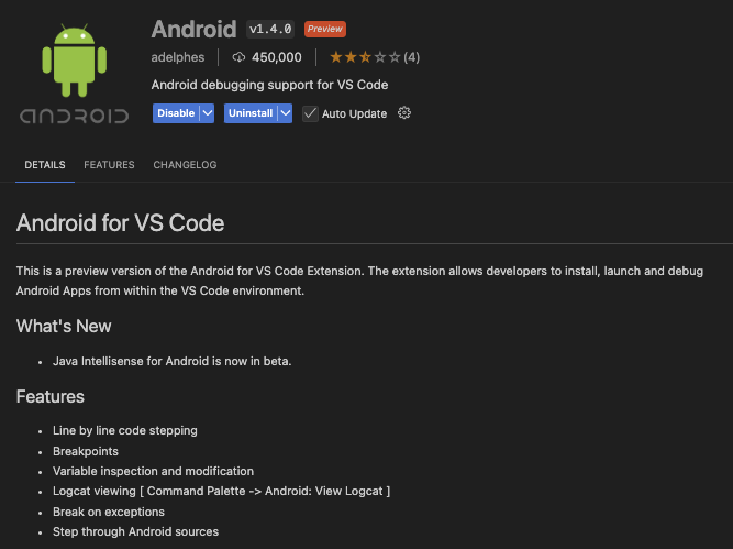 처음에 Android라는 이름의 extension을 설치하였는데, 그 이유는 Android라는 이름으로 extension을 검색했을 때 가장 많은 다운로드 수를 가지고 있었기 때문이다.