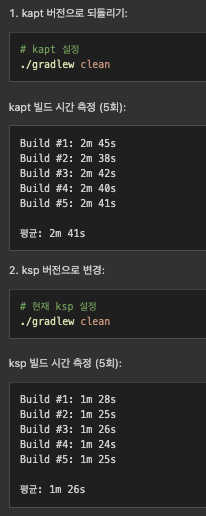 kapt를 사용하는 부분이 room 하나밖에 없었는데, 그것 하나 사용하는 것 때문에 빌드 시간이 1분이 넘게 차이가 나는 것을 직접 확인할 수 있었다.