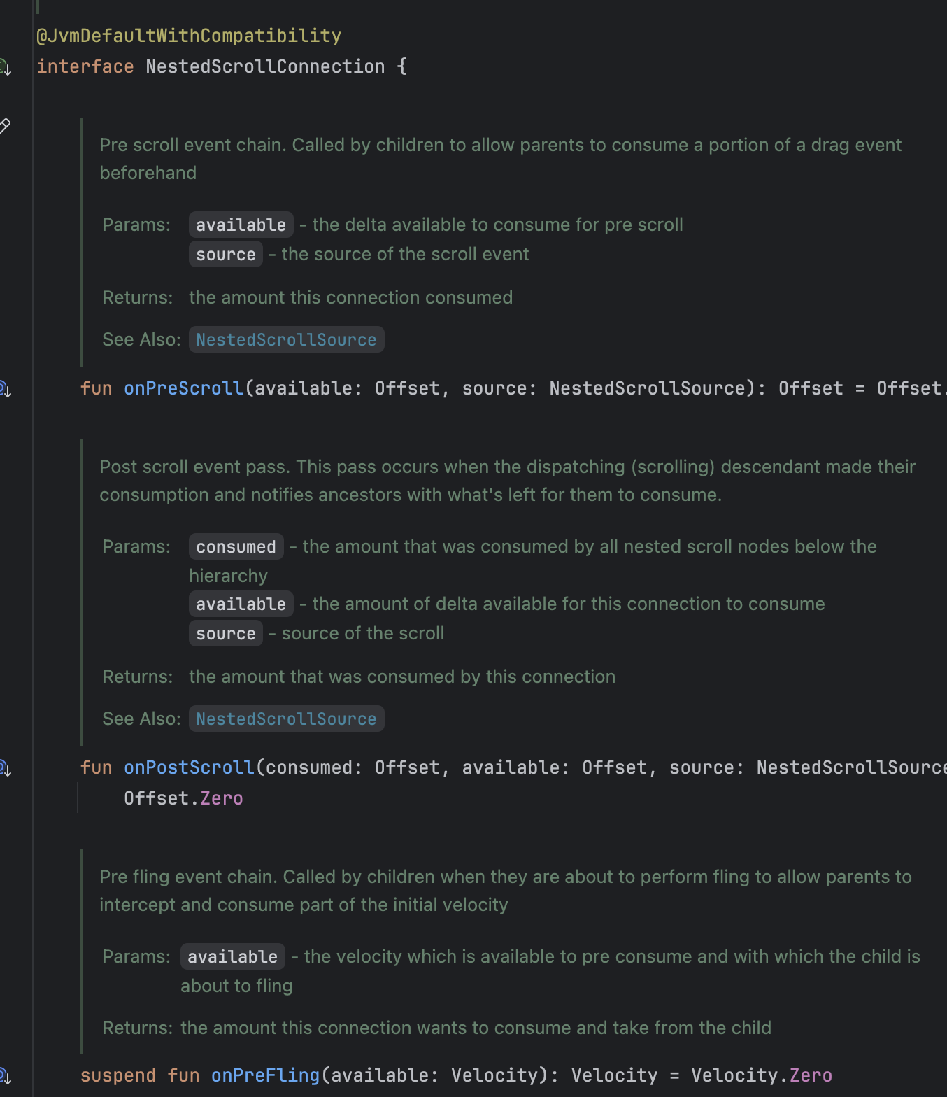 LazyColumn에서 스크롤을 하기 전 onPreScroll이 호출되고, 스크롤 이후 onPostScroll이 마지막에 남은 스크롤이 있다면 처리하게 되는 것이다.