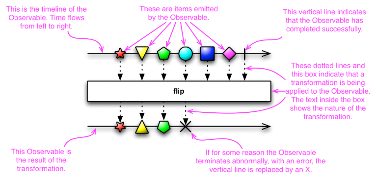 첫 번째 타임라인의 끝 파이프(|)는 Observable에서 데이터 발행을 완료하였다는 의미.
