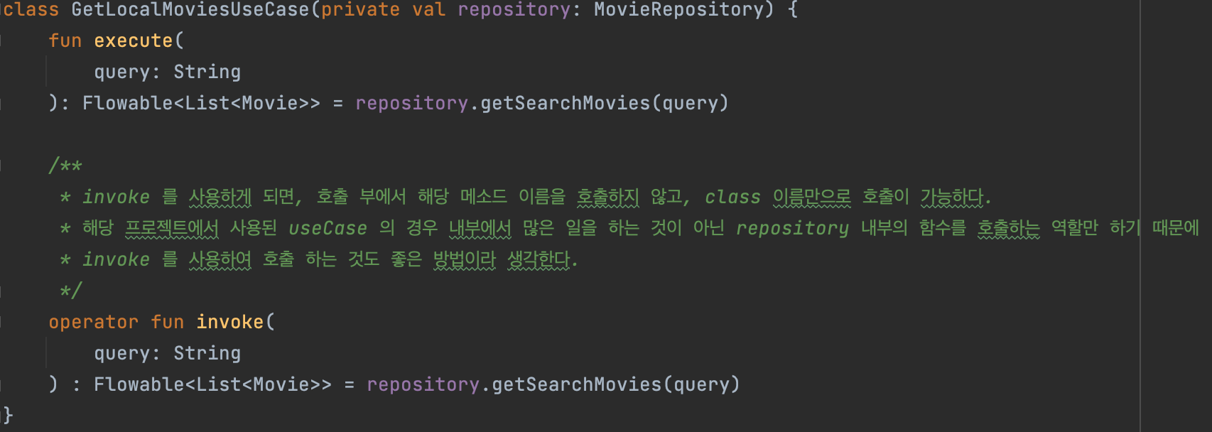 하지만, UseCase 에서는 별 다른 작업을 수행하지 않고 Repository에 있는 함수를 호출하는 작업 하나밖에 없기 때문에 invoke 를 사용하는 것도 좋은 방법이라고 생각하여 이를 추가하였다.