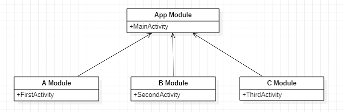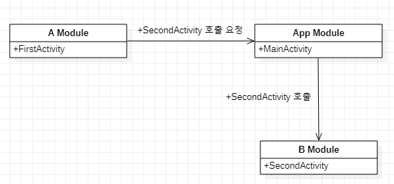 이와 같이 FirstActivity 에서 SecondActivity 를 호출하기 위해서는 App Module 에 호출 요청을 하고, App Module 에서 직접 B Module 의 SecondActivity 를 호출하면 되는 것이다.