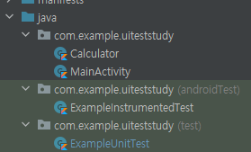 따라서, androidTest 가 아닌 Test 로 되어있는 패키지의 테스트 클래스에 테스트 코드를 작성해주어야 한다.
