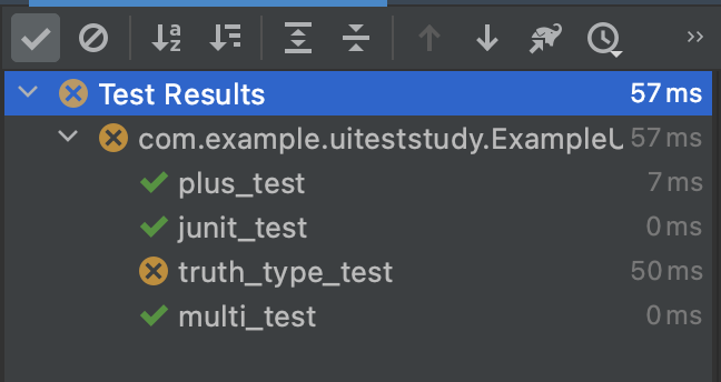 테스트 클래스 전체를 실행시켰을 때 Test 함수에 따른 성공과 실패 여부가 나오게 되는데, 실패한 부분만 나오는 경우 테스트 결과가 나와있는 창 상단의 옵션을 눌러보면 확인 가능합니다.