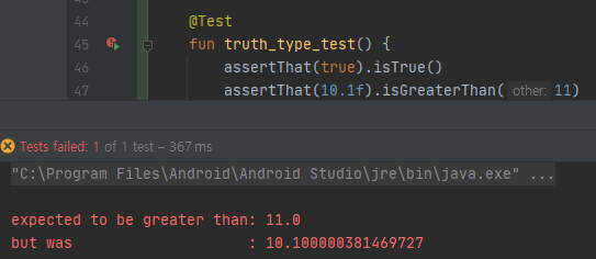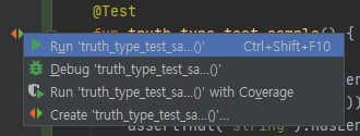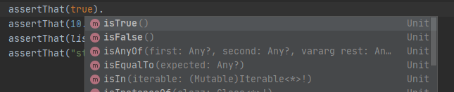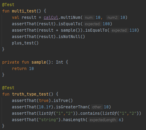 이곳에서 truth 라이브러리를 사용할 수 있는데, 우선 앞서 Truth 를 import 하였기 때문에 Truth 에서 제공하는 assertThat 메소드를 그냥 사용할 수 있다.
