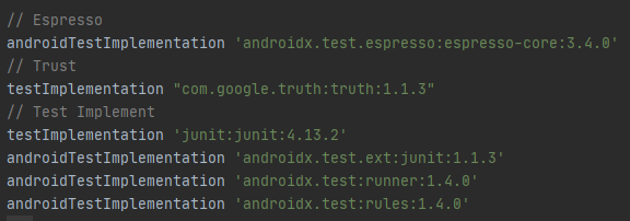 이전에 Espresso 를 사용할 때 그 외 테스트에 필요한 항목은 추가해두었기 때문에 위의 truth 라이브러리만 추가하였는데, Truth 를 통해 처음 테스트를 진행하고자 한다면 다음 항목들을 확인하길 바란다.
