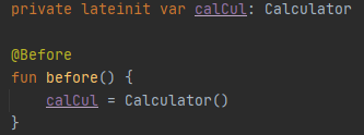 생성한 클래스를 사용하기 위해 lateinit 로 선언해두고, before 어노테이션을 사용한 함수 내부에서 테스트가 진행되기 전에 클래스를 생성해주도록 한다.