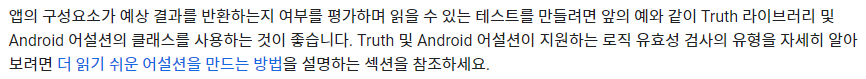 Unit 테스트를 진행함에 있어서 Junit4 만 사용해도 되지만 공식 developer 문서에도 사용하는 것이 좋다는 언급이 되어있기도하여 Truth 를 사용해보자 생각하였다.